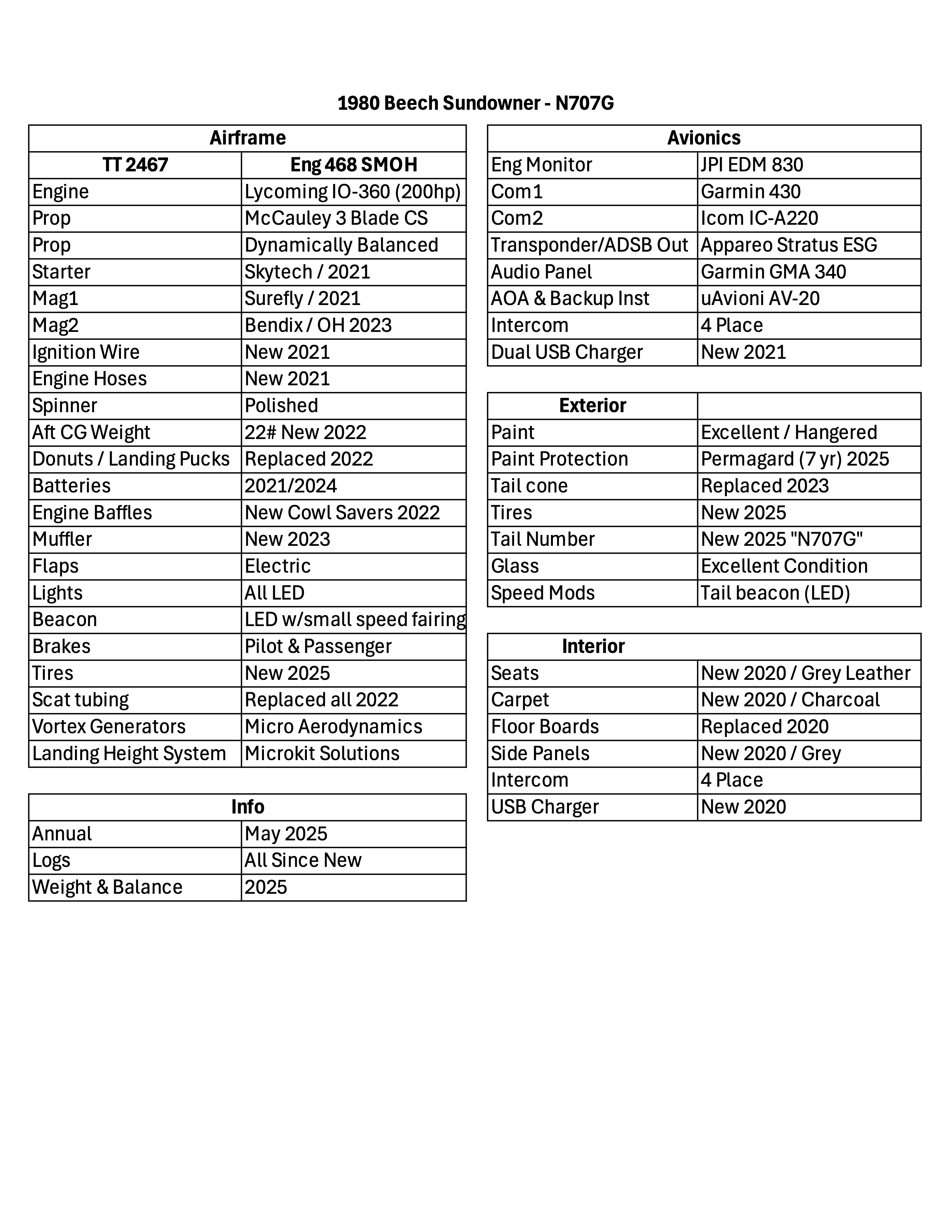 The ONLY IO-360 (same engine as the Sierra), 3 Blade Constant speed Sundowner in the country, maybe the world. A true unicorn. In great shape. As most of you know, I did have a land gear collapse on landing last year, so replaced left wing and stabilator. Painted and looks good as new. Below is a summary of the aircraft. I did change the tail number from 6710L to 707G, because I like the number.