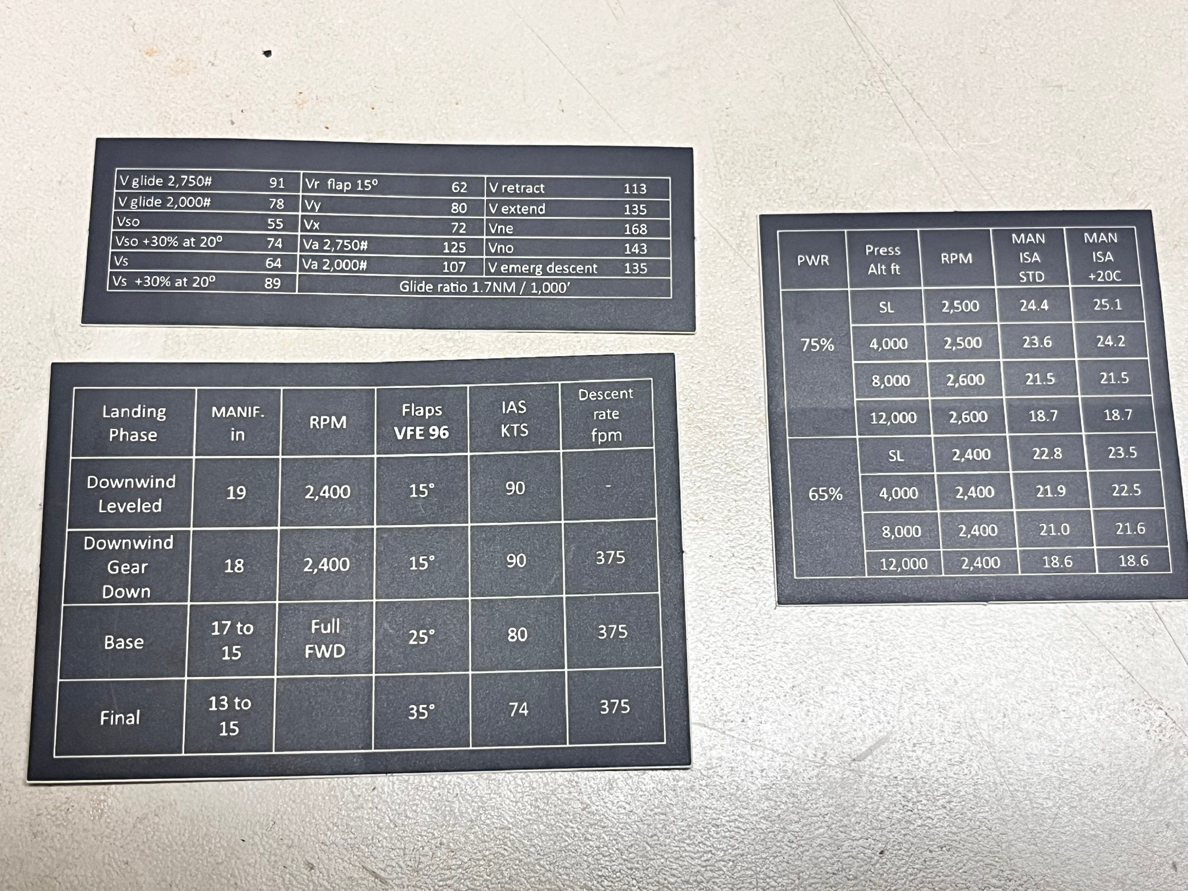 I made those custom decals for my Sierra B model. This includes speeds, my landing settings and the most usual engine settings for 65% and 75% for ISA Std and ISA Std +20 degC. I use them all the time so this can be useful to share as another Christmas present. I will send a set to the first 8 asking.